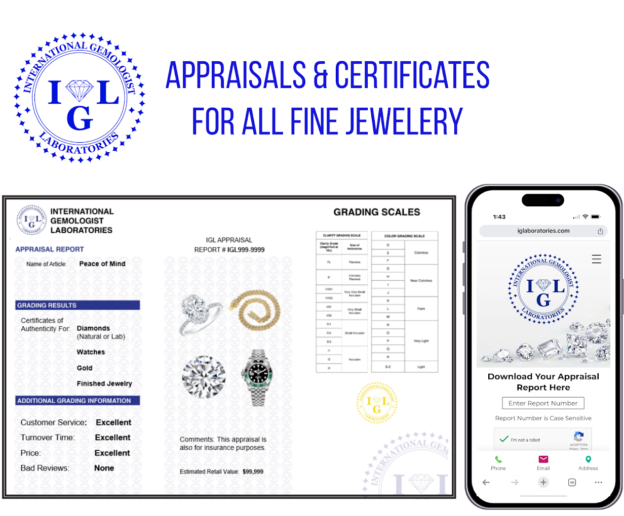 The IGL Certificate provides a reliable and accurate documentation of your diamond or jewelry's identity and grade based on the internationally recognized diamond grading system. Using state-of-the-art equipment, each diamond or piece of jewelry is analyzed by a certified gemologist in order to provide the most accurate description of the product’s quality and characteristics.